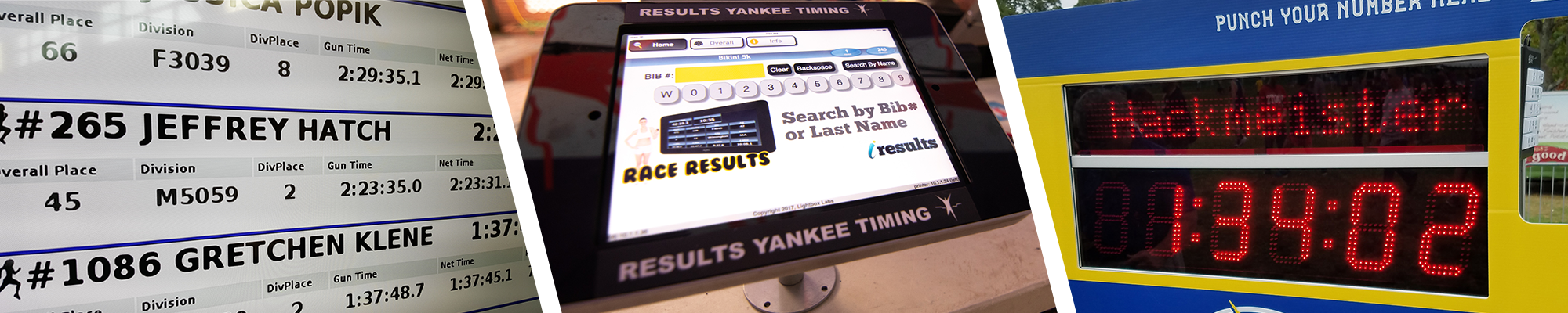 iResultsLIVE is a collection of technology for delivering race results in unique and interesting ways. Our on-site systems are custom built and provide for electronic race-day registration as well as providing kiosks and printers for viewing race results on tablets and race clocks. If the runner provides an email address while signing up, they will receive their results via iResults Live in an email message on their cell phone within minutes after they finish.
